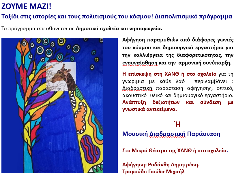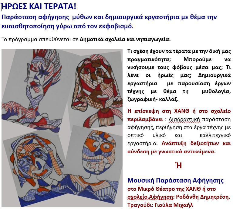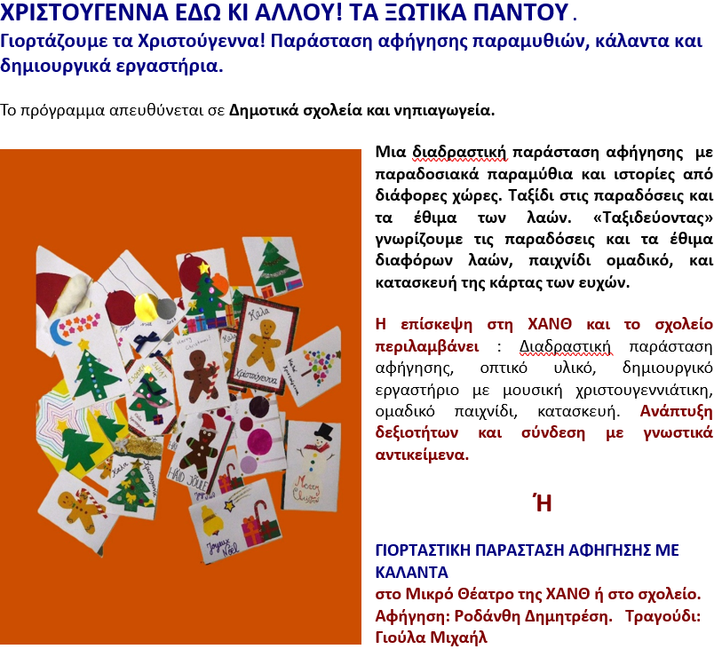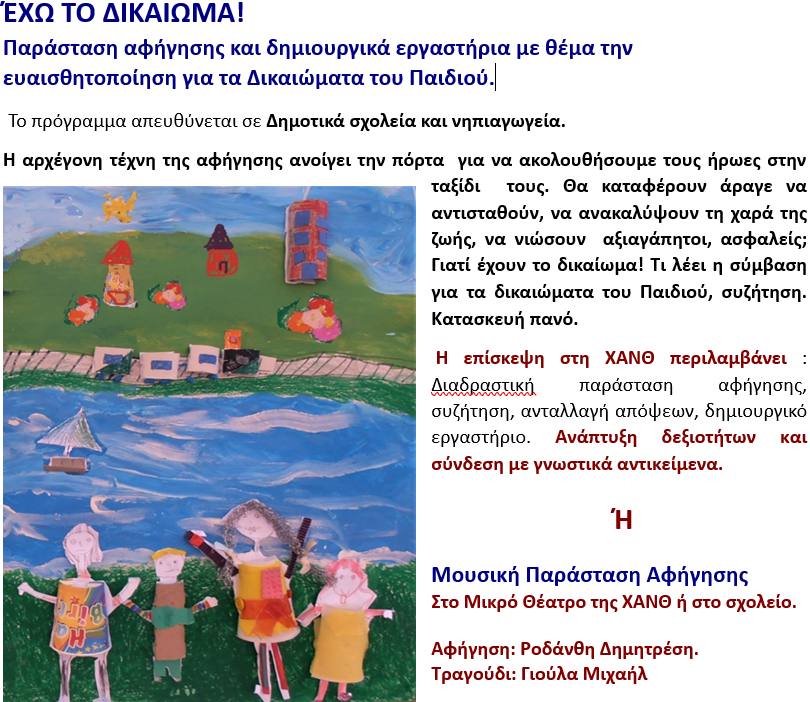 Παραστάσεις αφήγησης και δημιουργικά εργαστήρια για τα δικαιώματα των παιδιών, τη μυθολογία, τη διαπολιτισμικότητα, τον εκφοβισμό, τη Γιορτή των Χριστουγέννων.